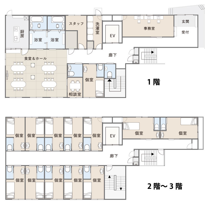 1階は共有スペース、2階から3階は居室スペースが中心となります。