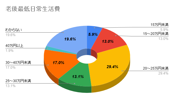 生命保険文化センターが行った令和元年に行った意識調査によると、「夫婦二人」老後生活に必要な「最低日常生活費」は、平均「20万円~25万円」が約30%。