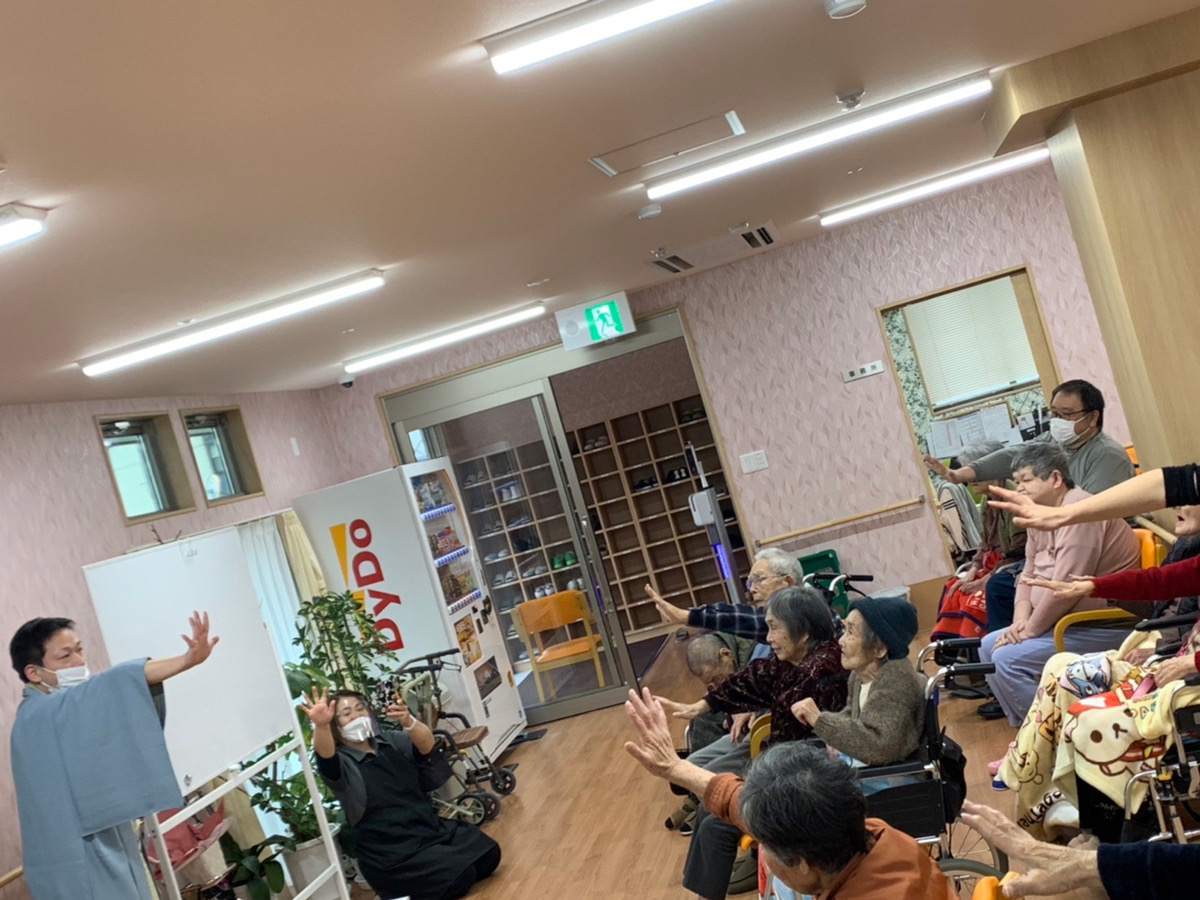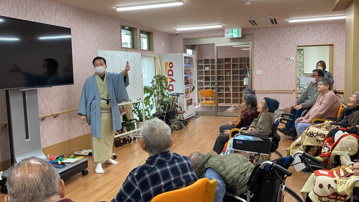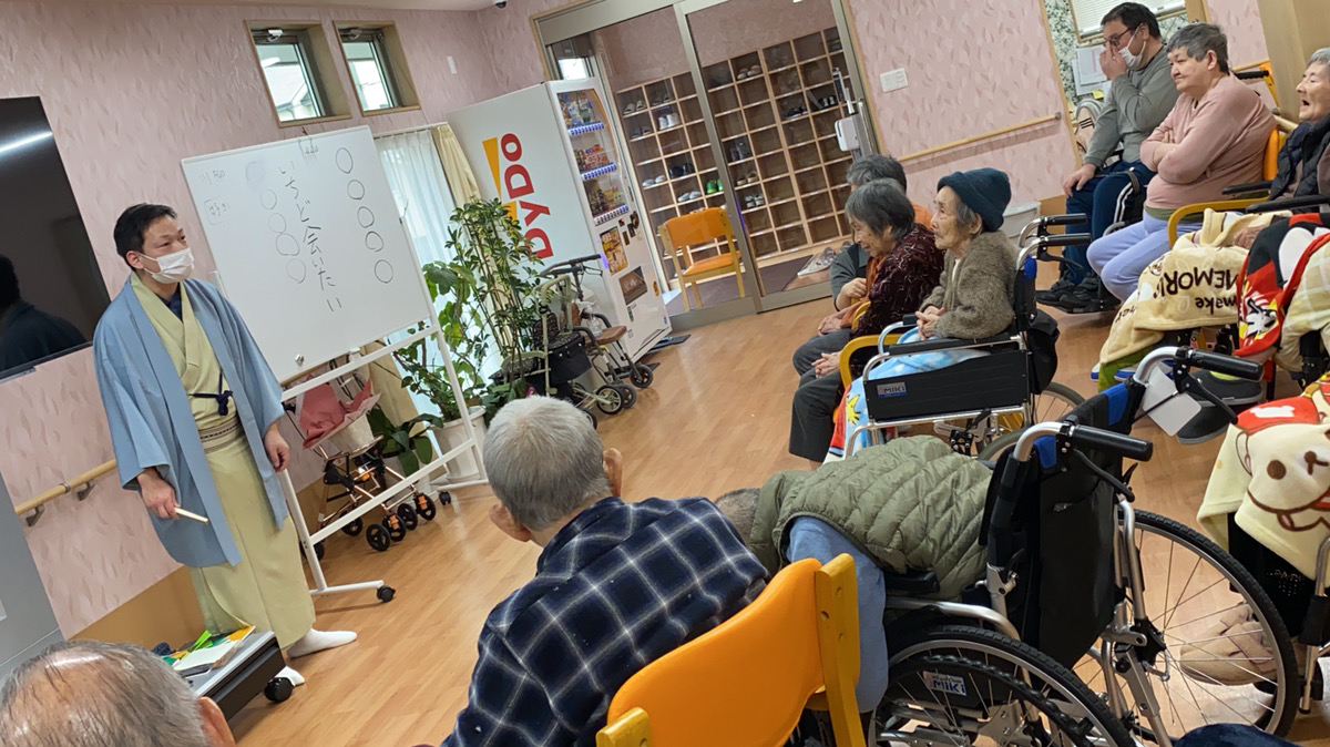 落語家の「桂 佐ん吉」さんがお越しくださり、落語だけでなく入居者様も参加して1つの川柳を完成させたり体操など様々な催しをしていただきました。