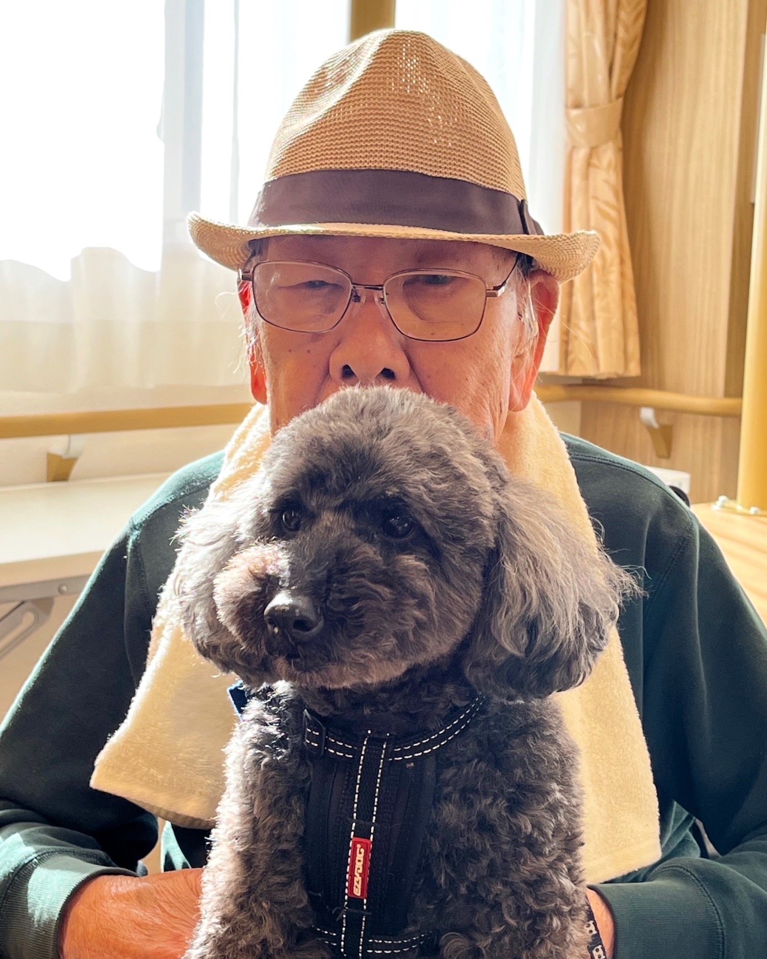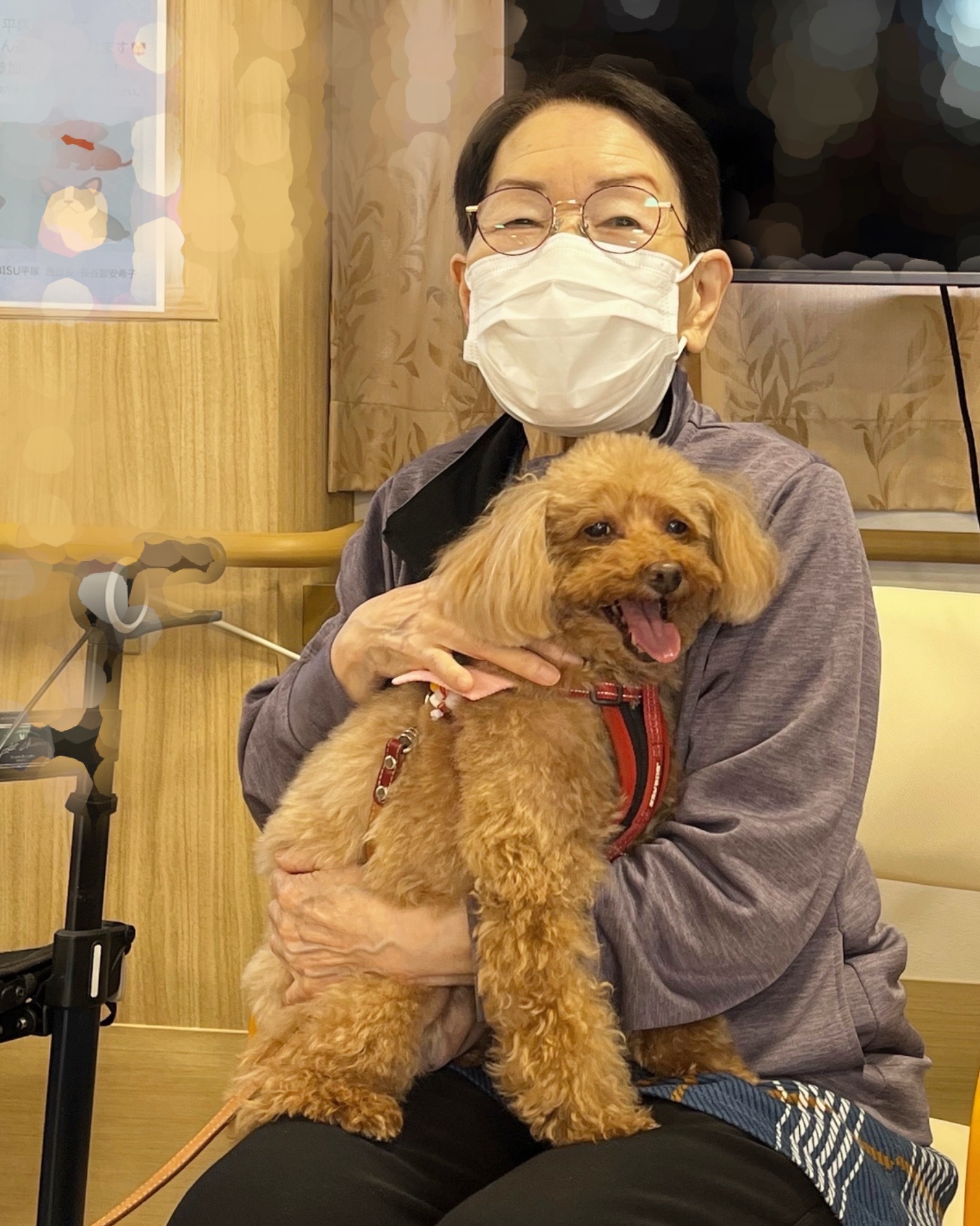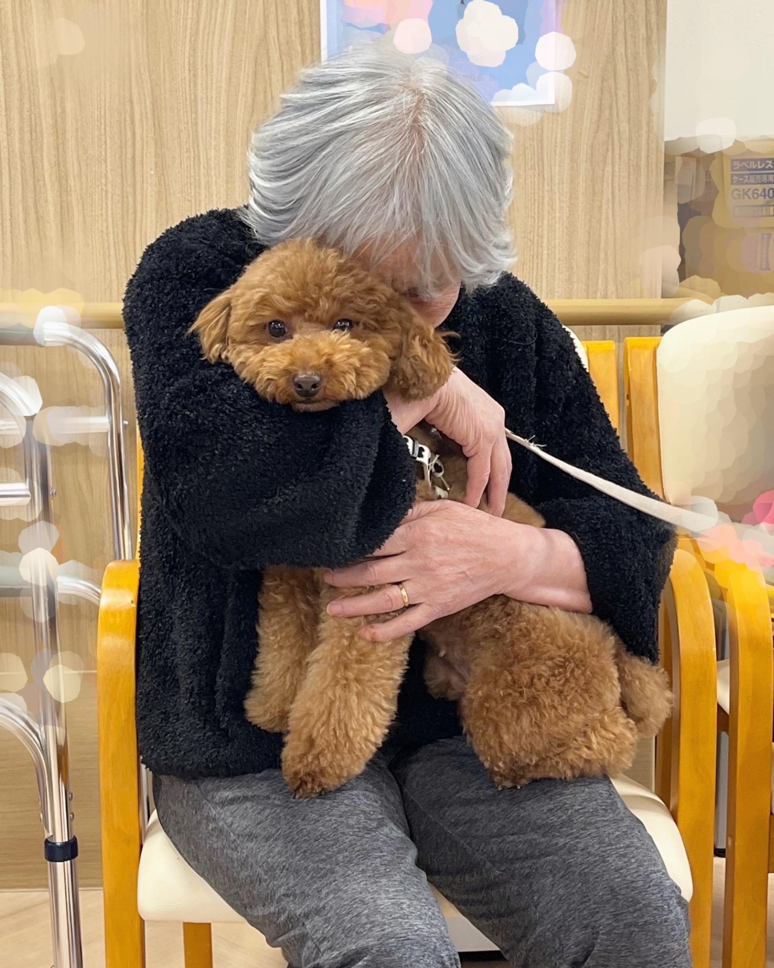 小さなワンちゃんを膝に乗せ抱きしめ、感極まった様子の利用者さま…。