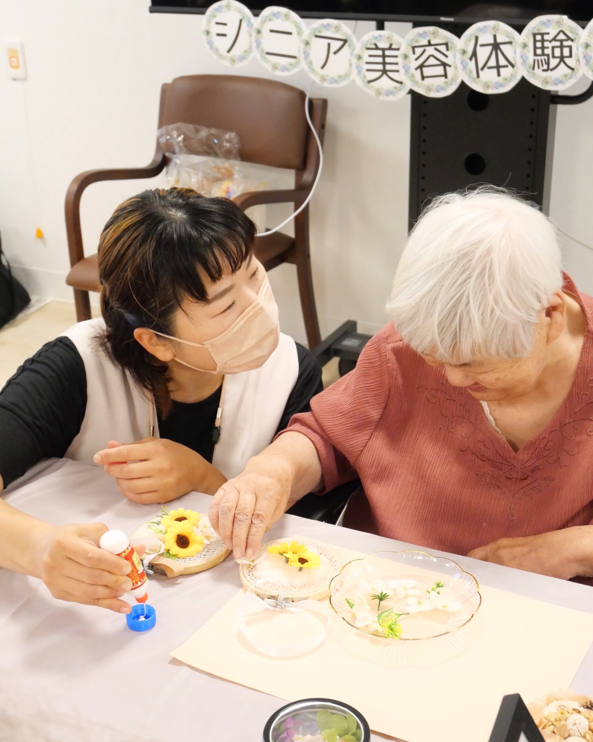 @care.beauty.kakiura さまをお招きして、利用者の皆さまとお花を使ったお部屋に飾れる装飾品を作りました!