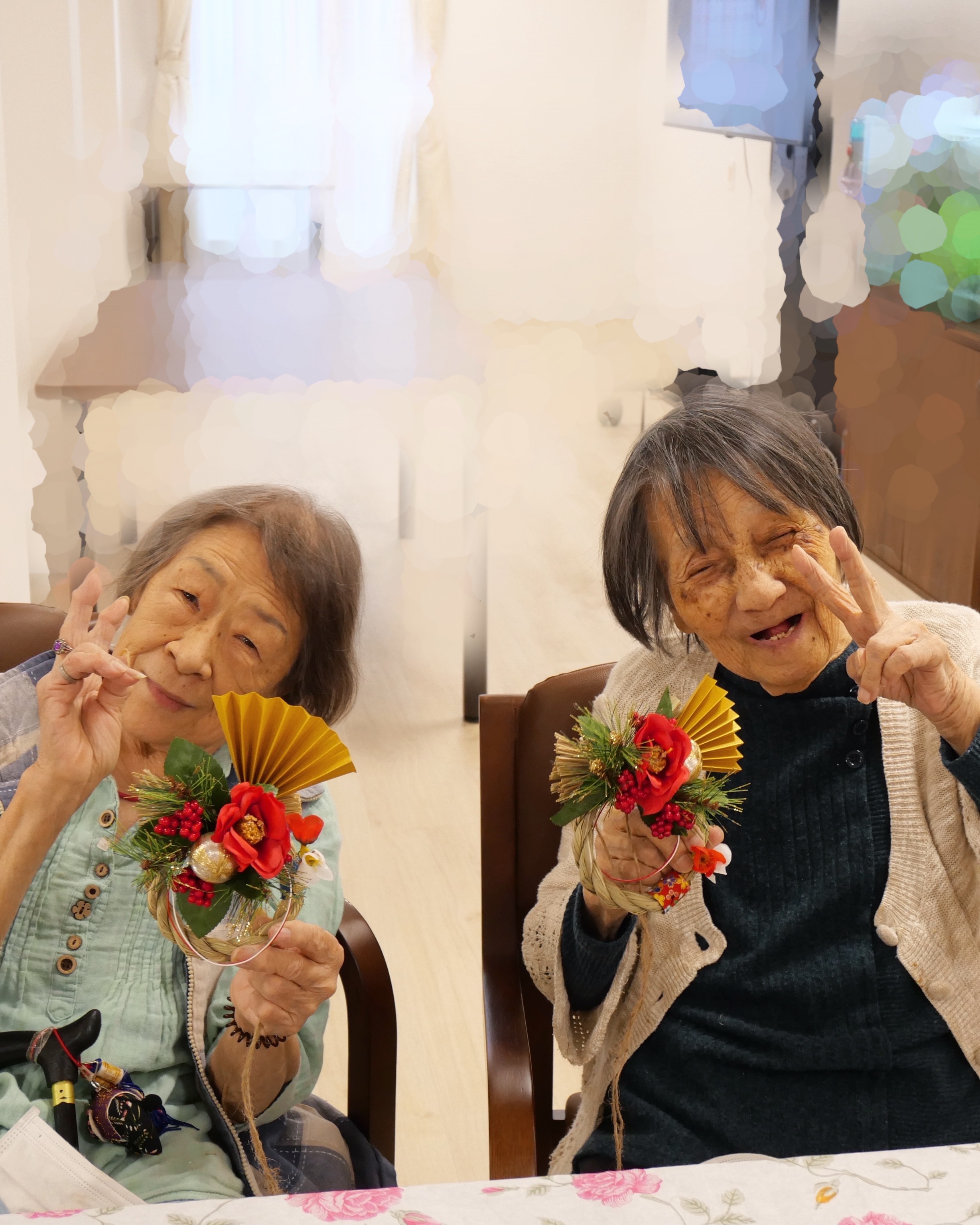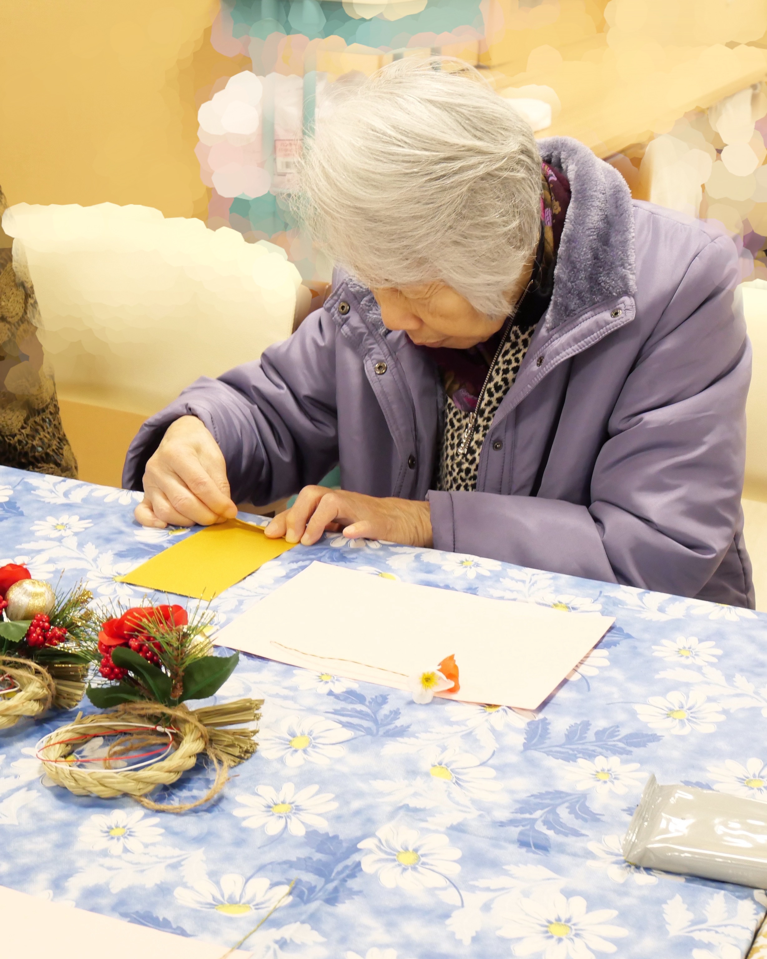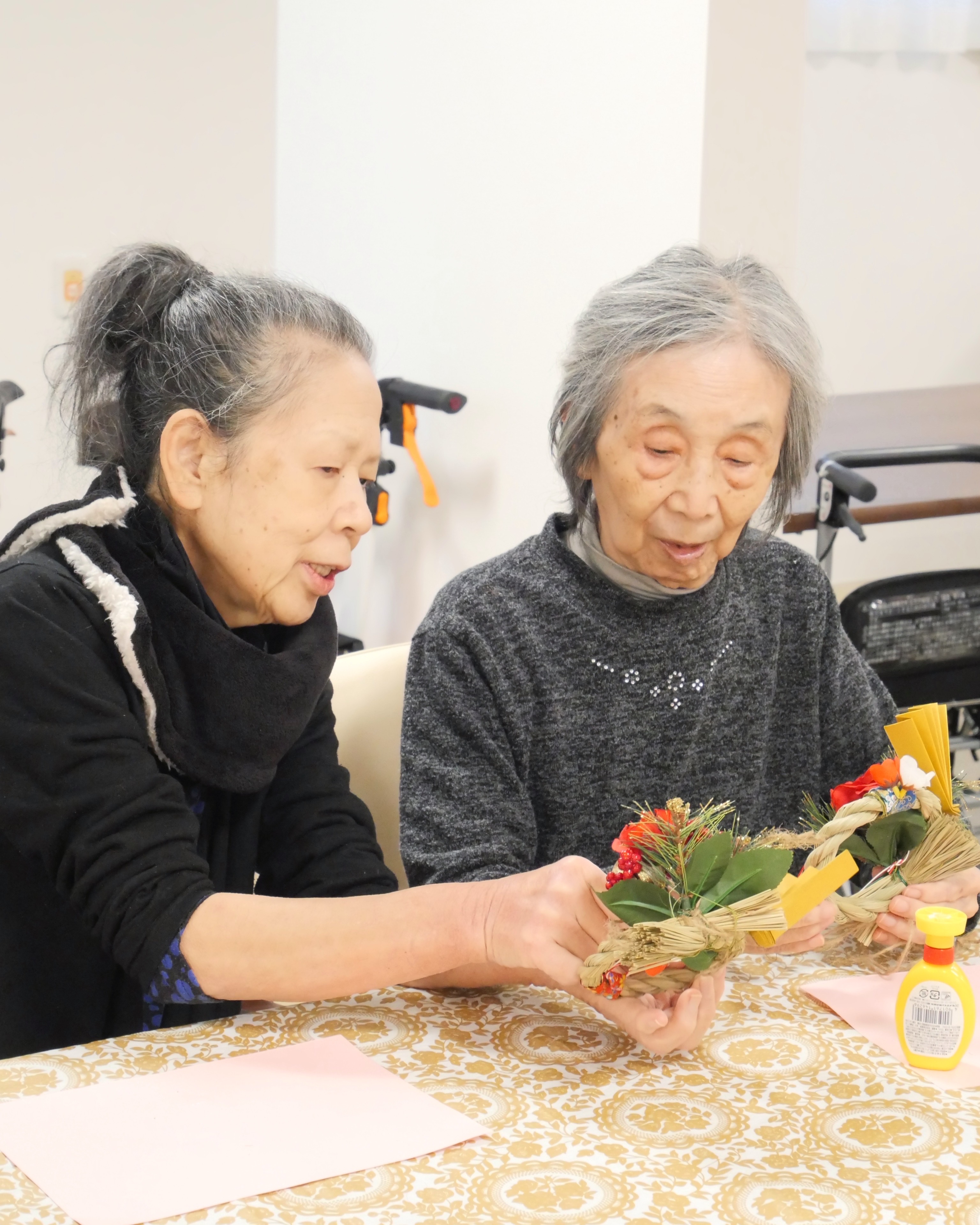 細かい作業が苦手な方は、職員はもちろんですがお隣の方が手を貸してくださる為、皆さま揃って立派な正月飾りを完成させる事が出来ました✨