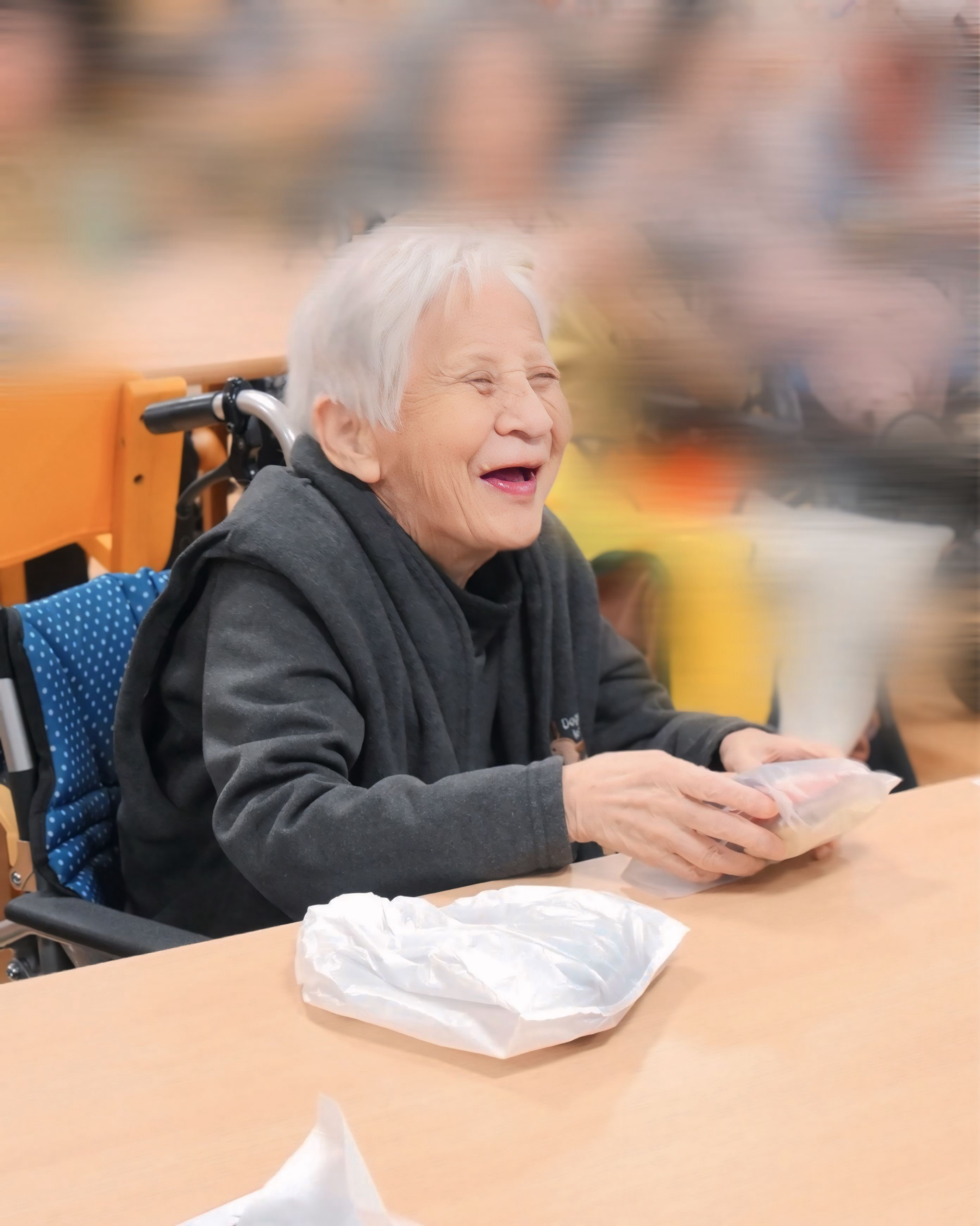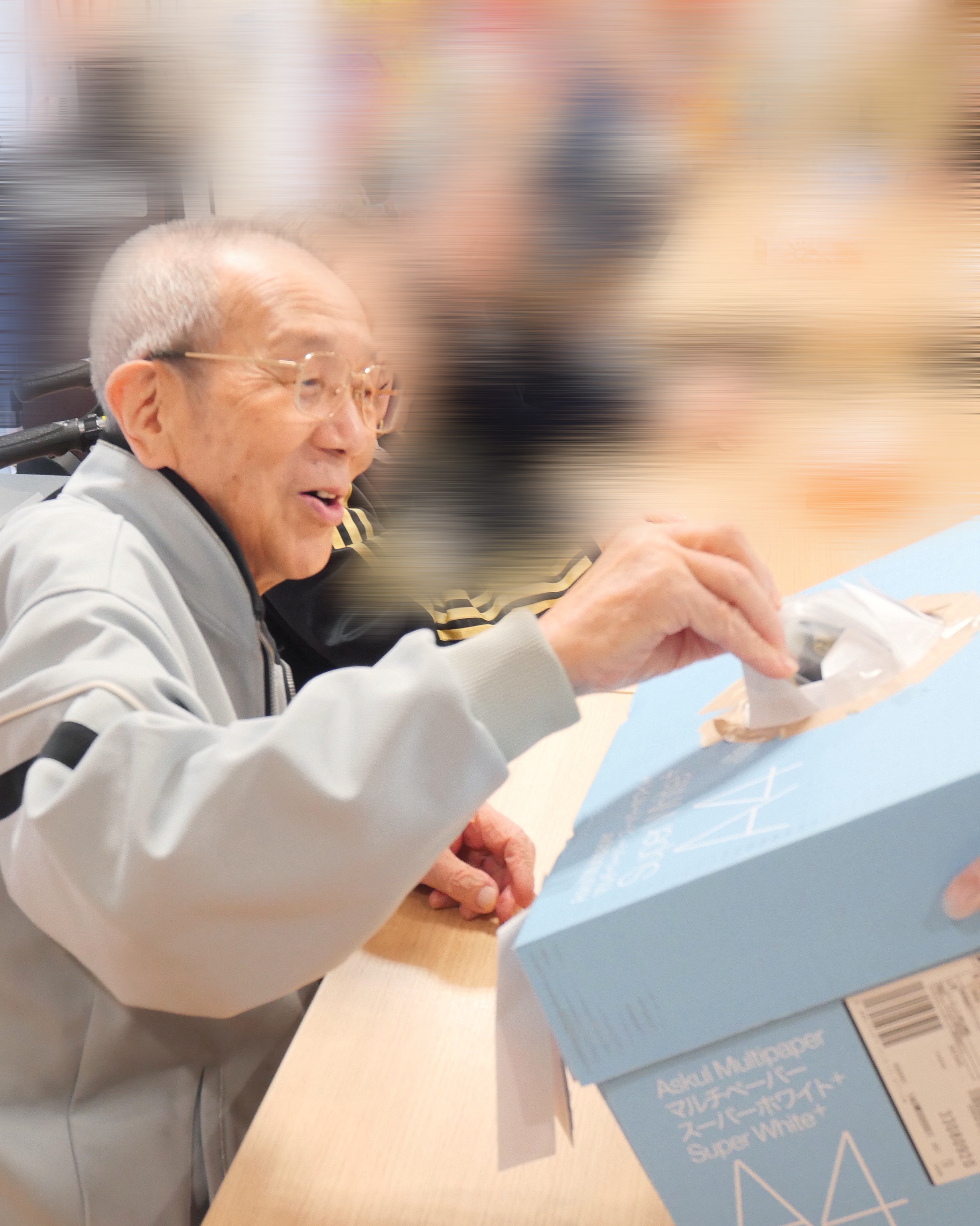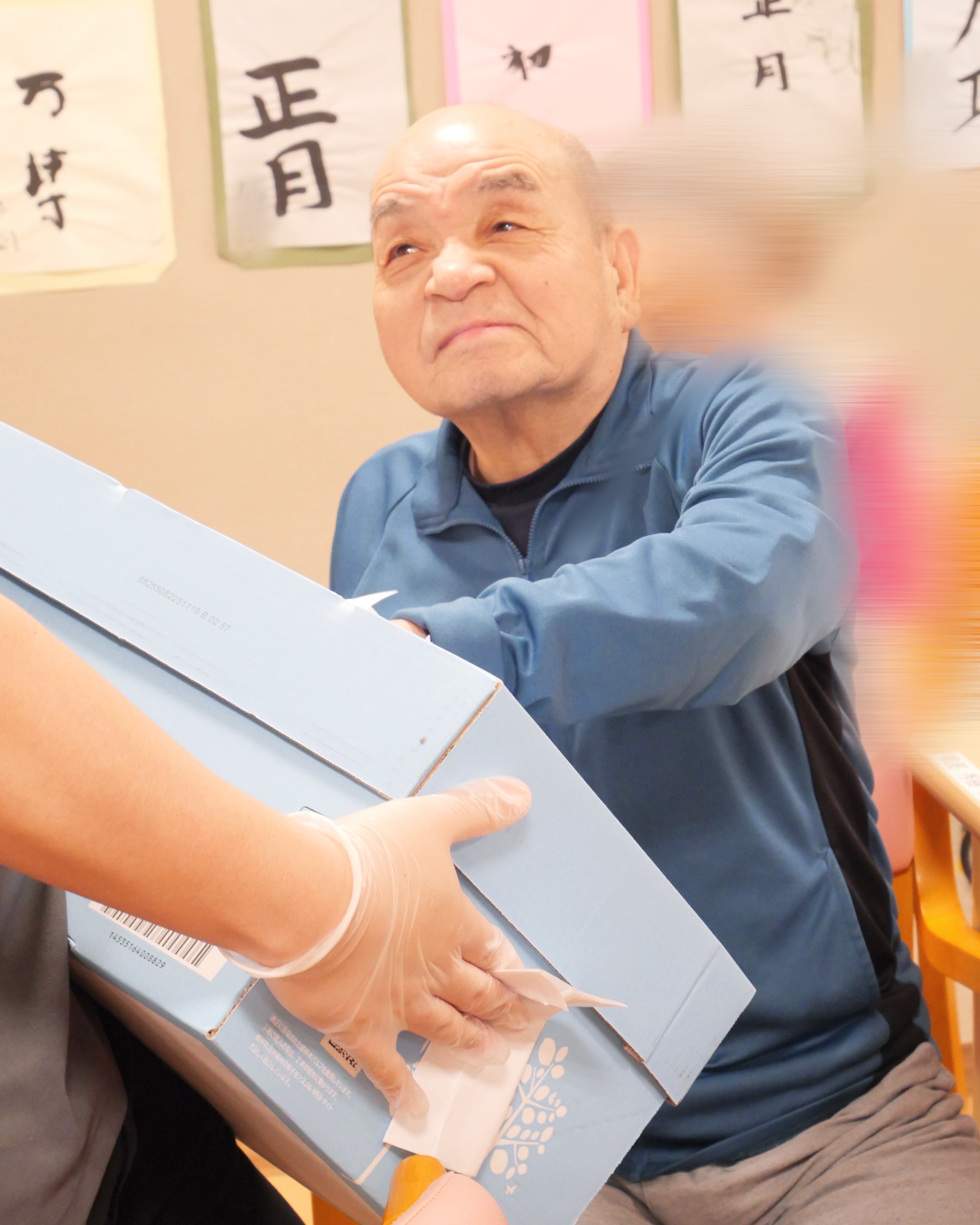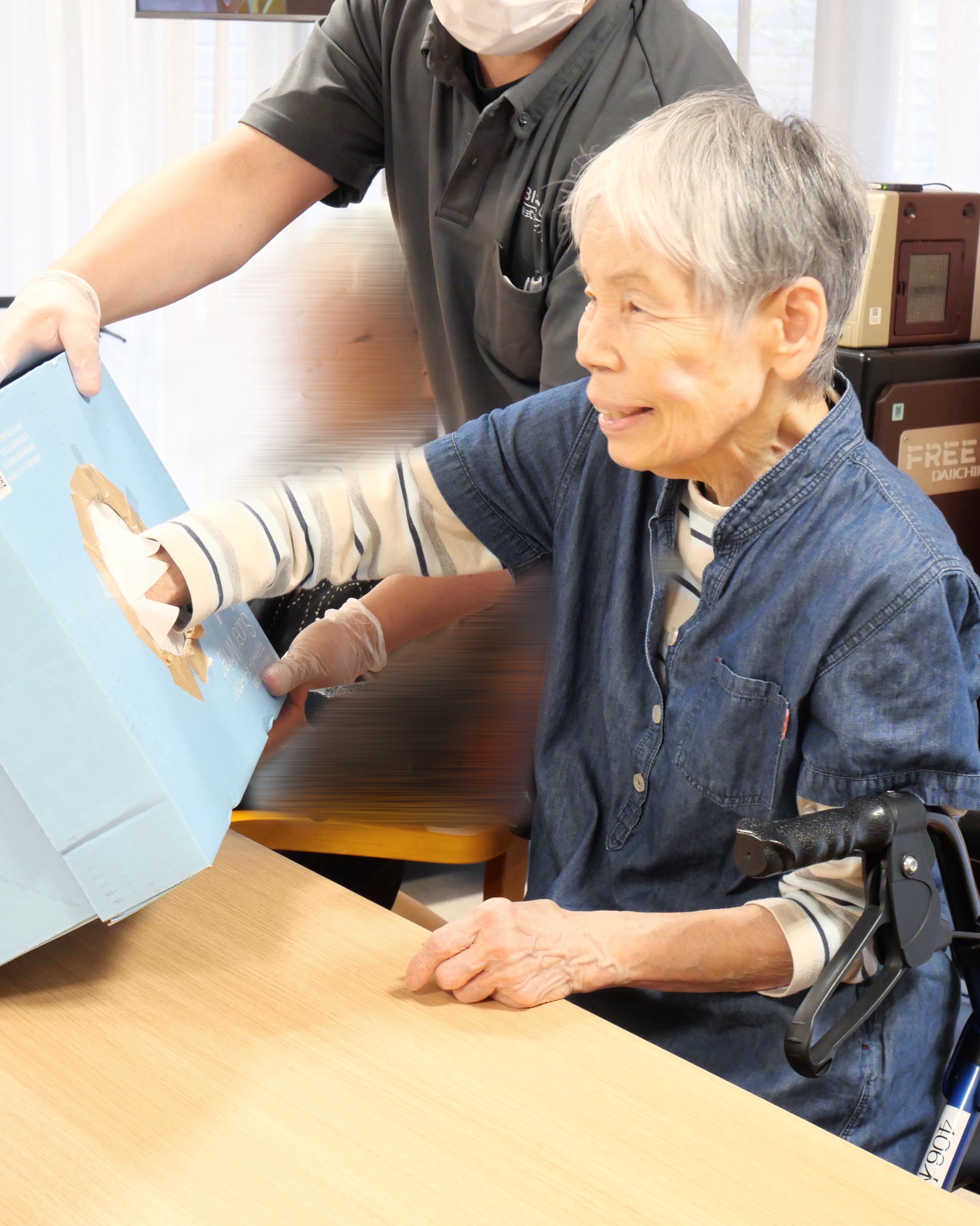 箱の中から出てきたお菓子に満面の笑みの利用者さま😆